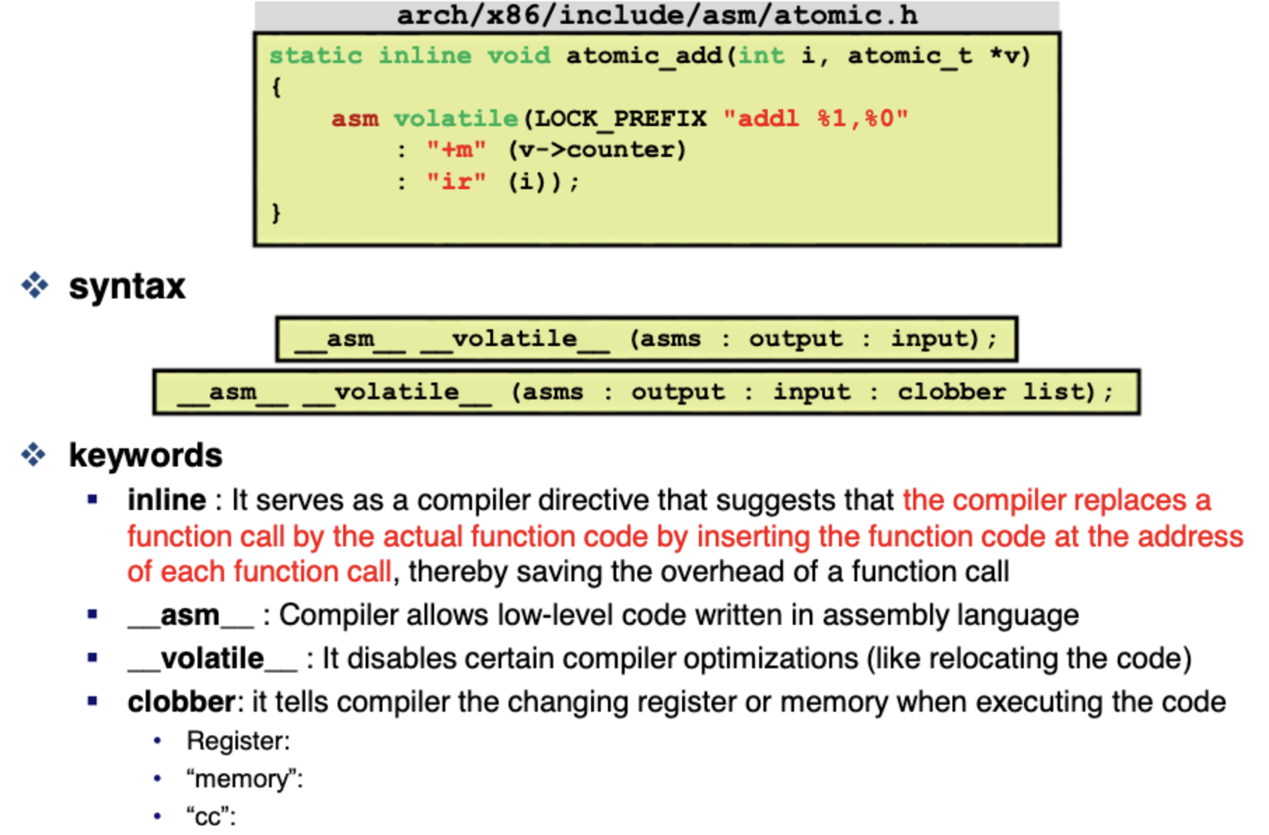 inline으로 함수가 호출되는 방식이 아닌 직접 코드를 삽입하며 어셈블리 언어로 구현된다.