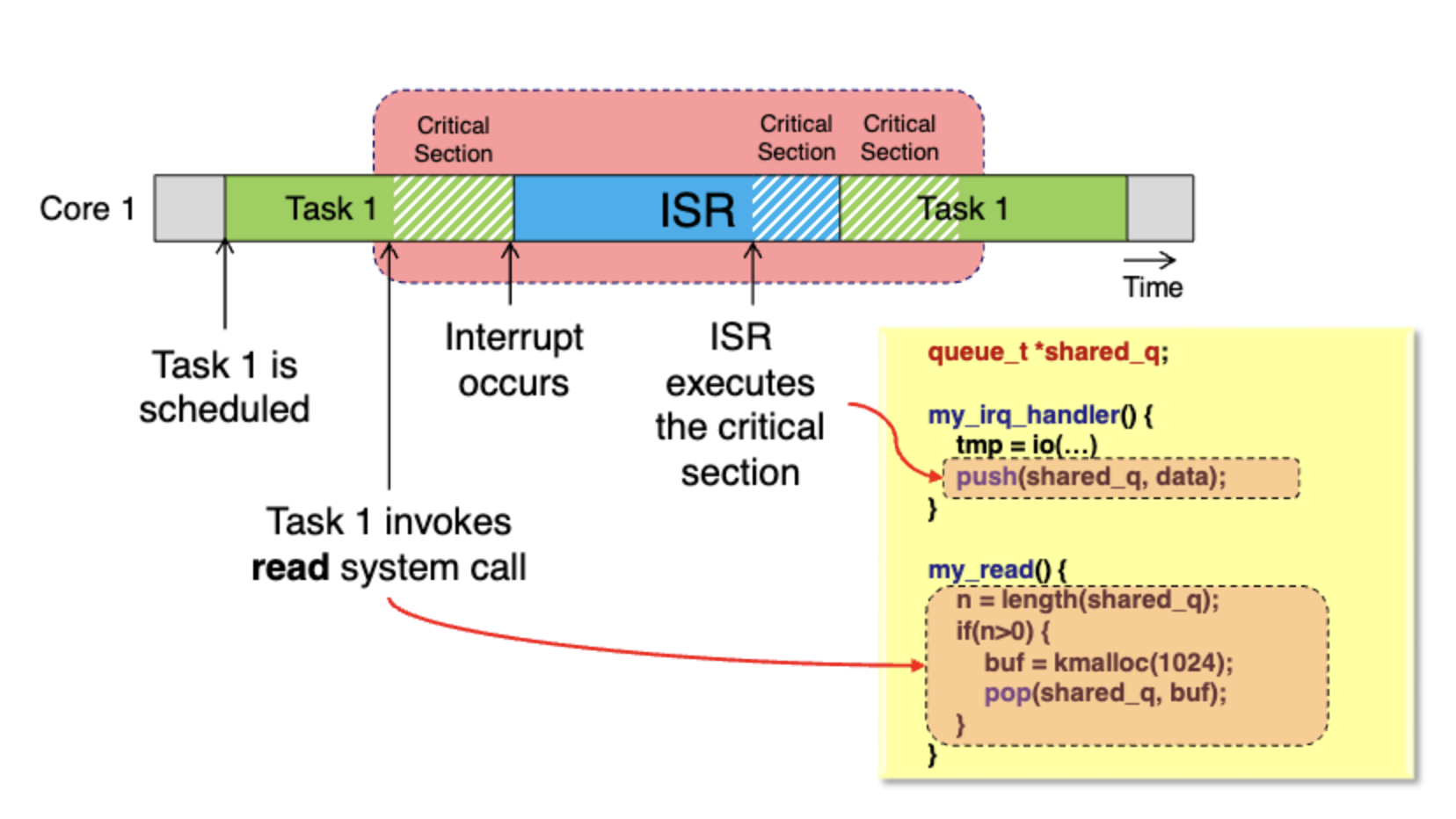 1번 task가 queue에서 데이터를 하나 read하려고한다. 즉 critical section에 진입한다. 그런데 중간에 interrupt가 발생해버렸다. Interrupt Service Routine이 interrupt handler를 호출하고 queue에 push작업을 처리하려고 한다. task 1, 2에 의해 shared_q에 대한 race condition이 발생한다.