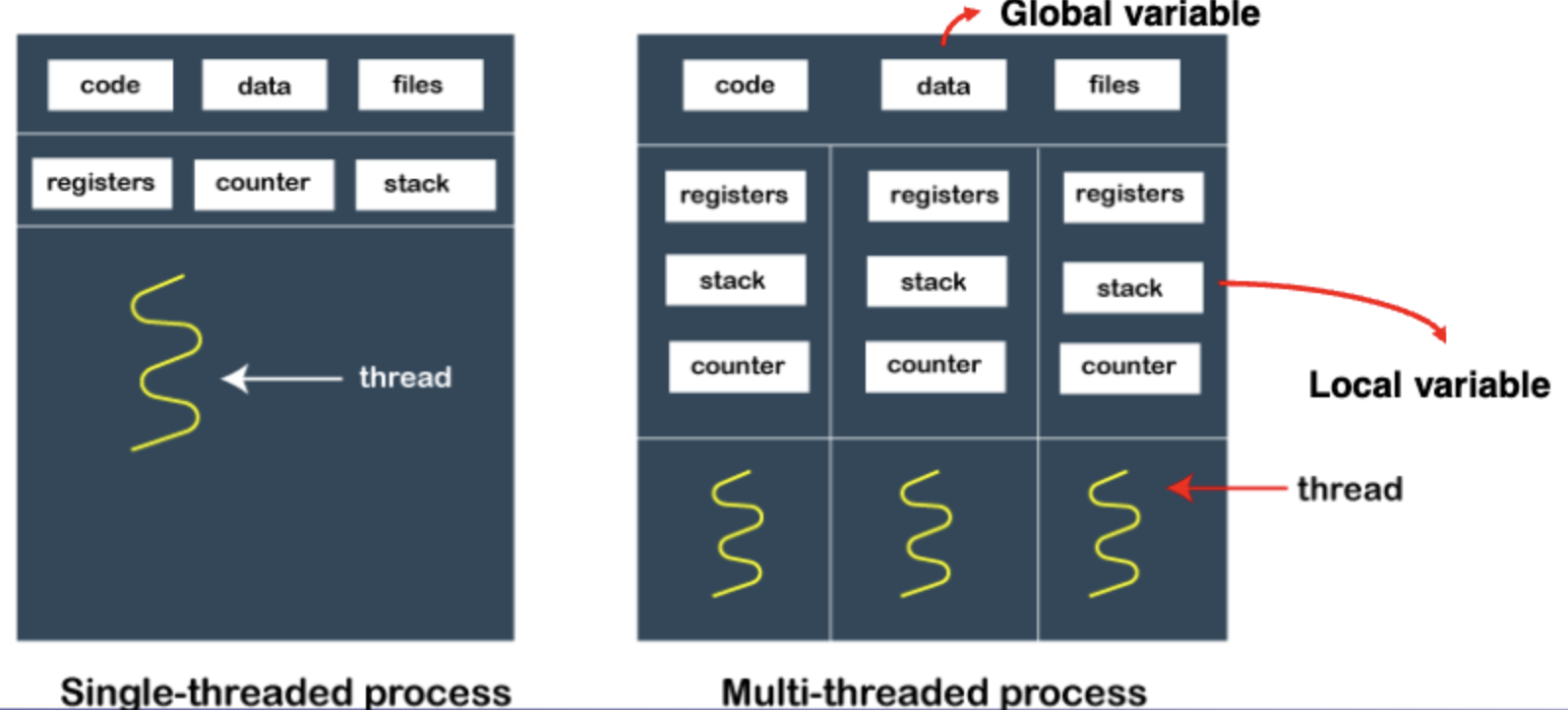 global variable들은 thread들 끼리 공유된다. data segment에 저장되어 있어 모두로부터 접근이 가능하다.
