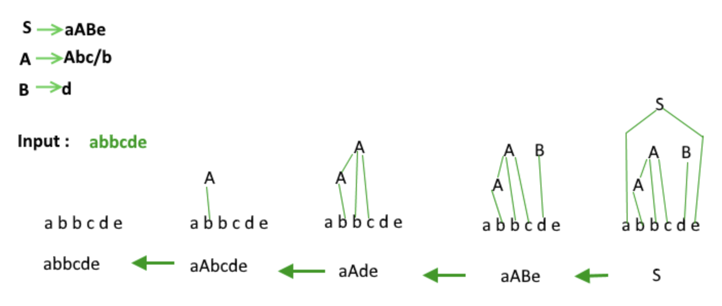 bottom up parsing은 right sentential form에서 leftmost simple phrase(handle)을 pruning해가는 방식이다.