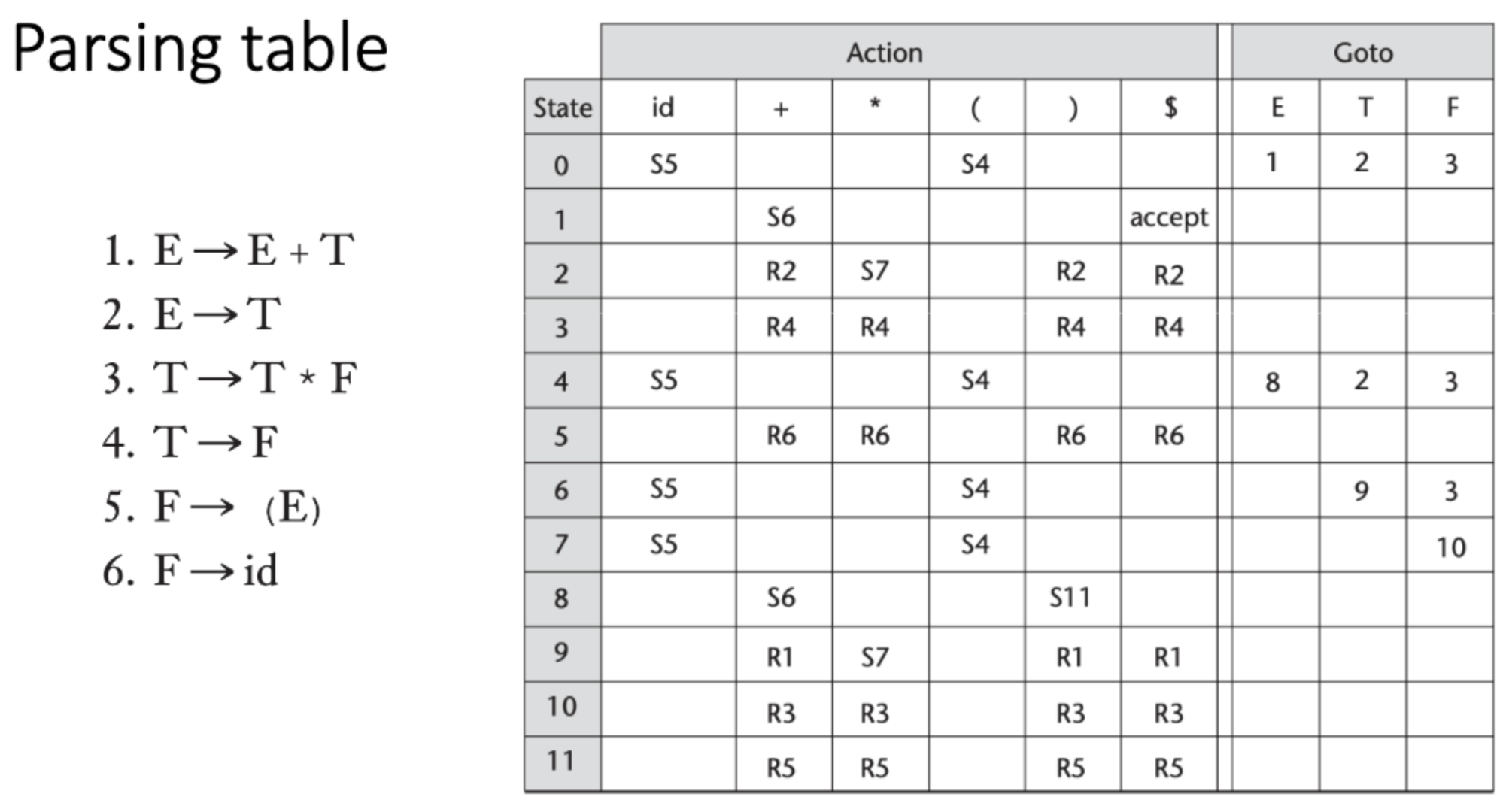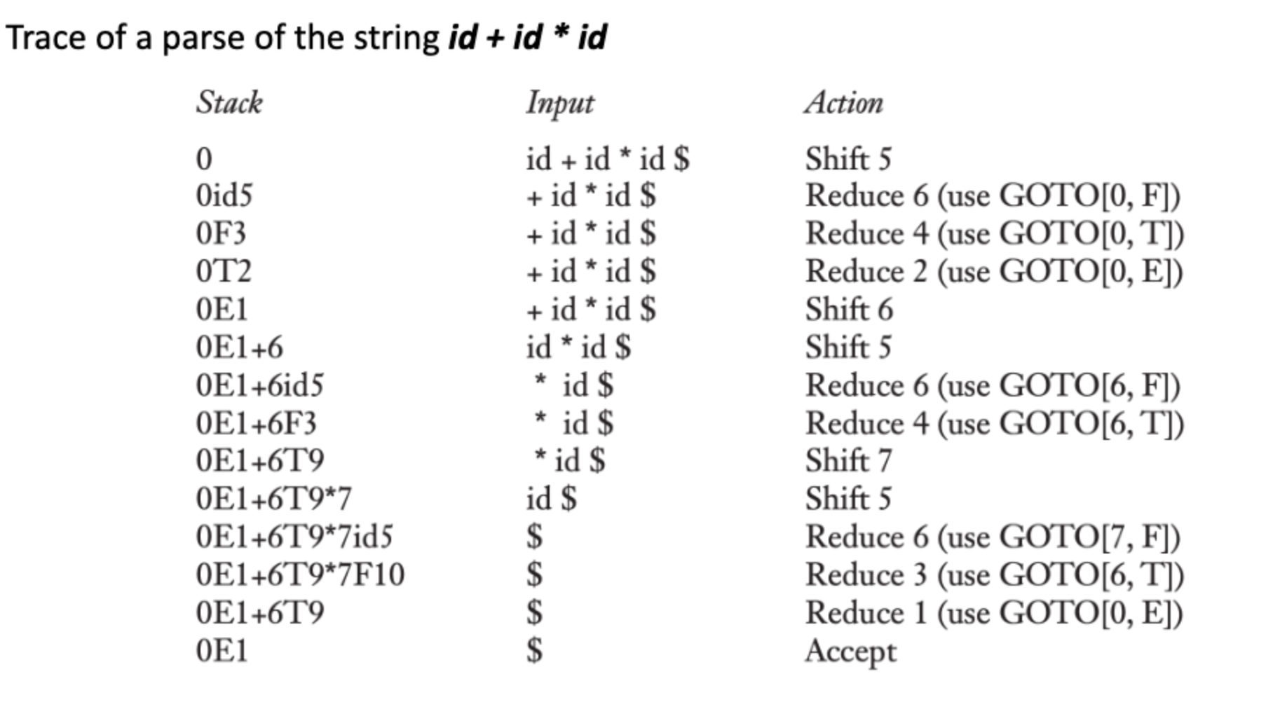 reduction action이 끝나고 stack에 어떤 state를 push해야 하는지 알려주는 GOTO가 있다.
