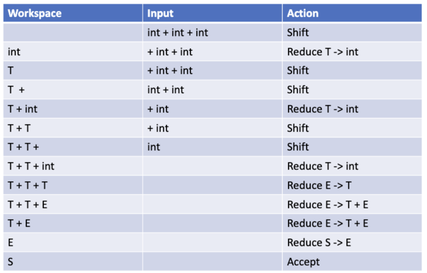 LR parser로 int + int + int를 전개를 해보자. 이때 버퍼(stack)를 하나 두고 최종 sentence에서 하나씩 버퍼로 shift한다.