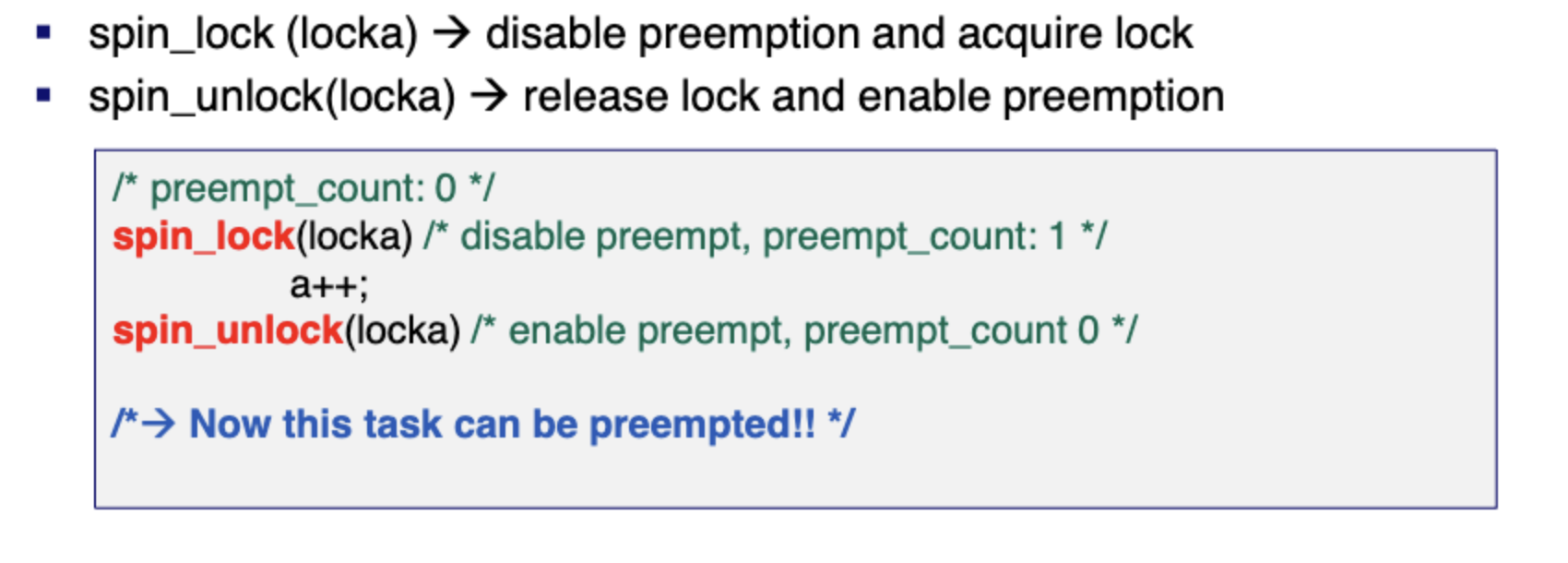 spin_lock은 preemption만 disable시킨다. unlock을 해주고 나서야만 이 task는 preemption이 가능하다.