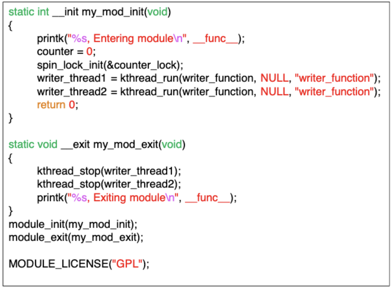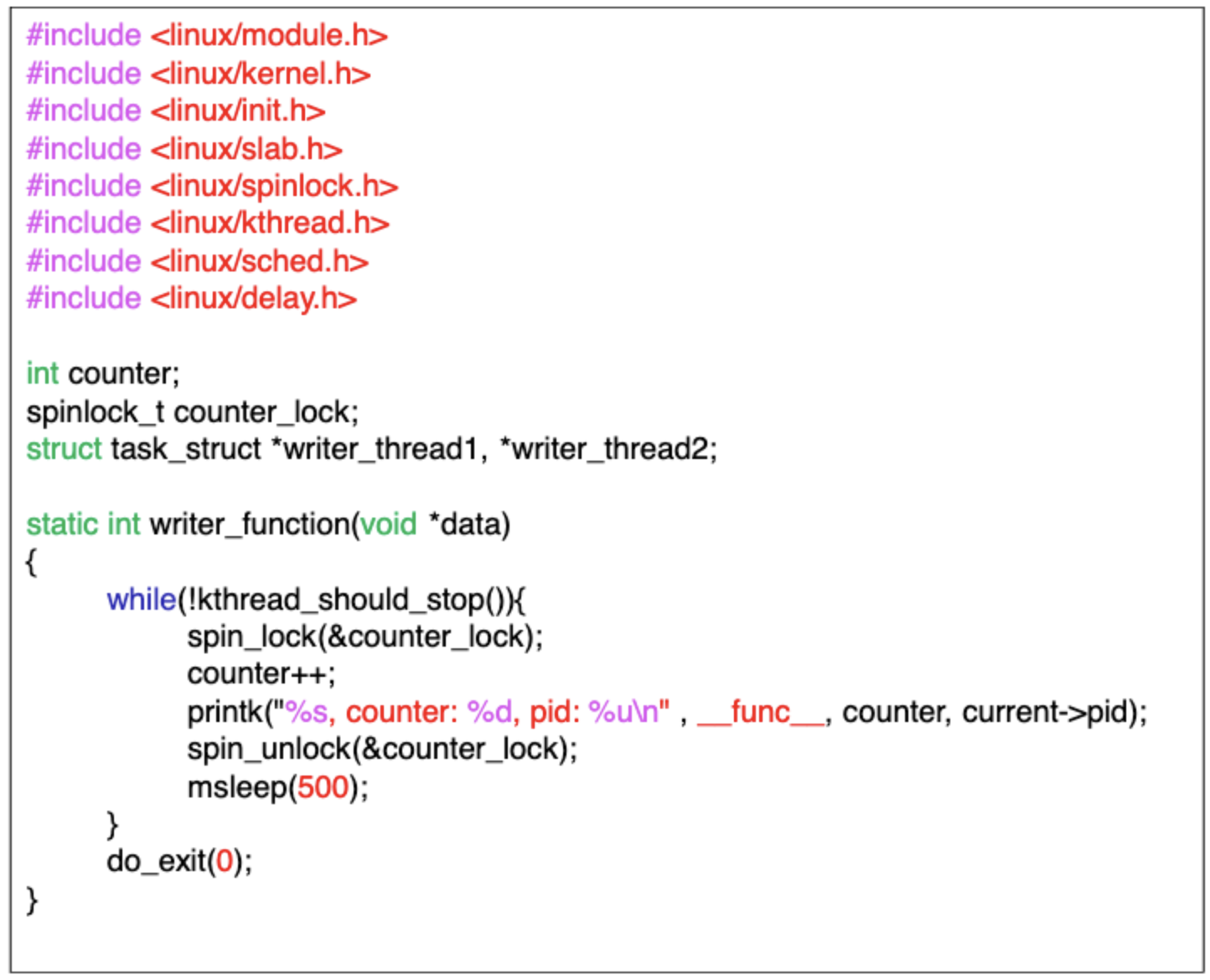 두개의 thread가 counter를 1씩 증가 시킨다. 공유자원인 counter를 1증가시키는 critical section을 보호하기 위해 spin_lock으로 감싼다. 두 쓰레드는 순차적으로 counter를 1씩 증가시킨다.