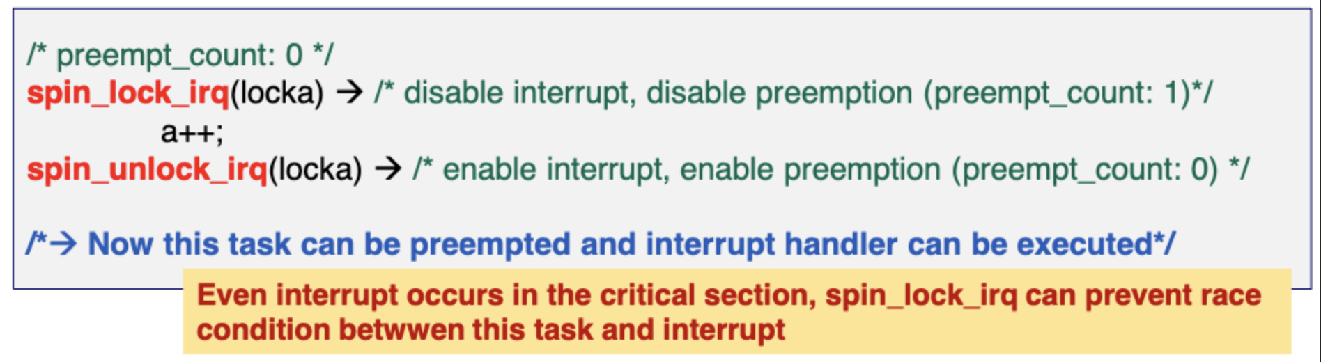 spin_lock_irq는 interrupt/preemption 둘다를 disable/enable 한다.