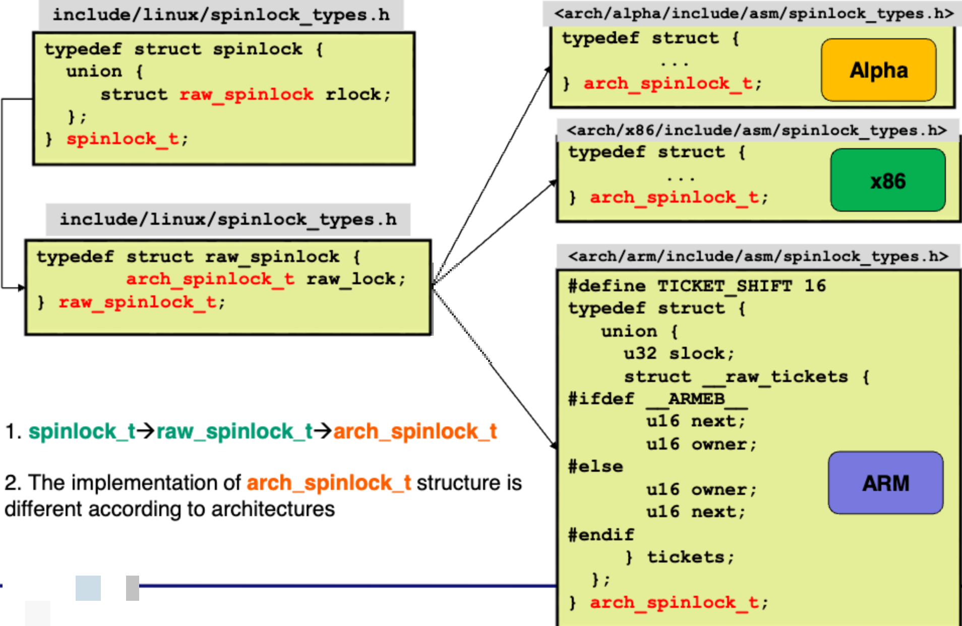 architecture 별로 구현된 arch_spinlock_t에 따라 추상화되어있다.