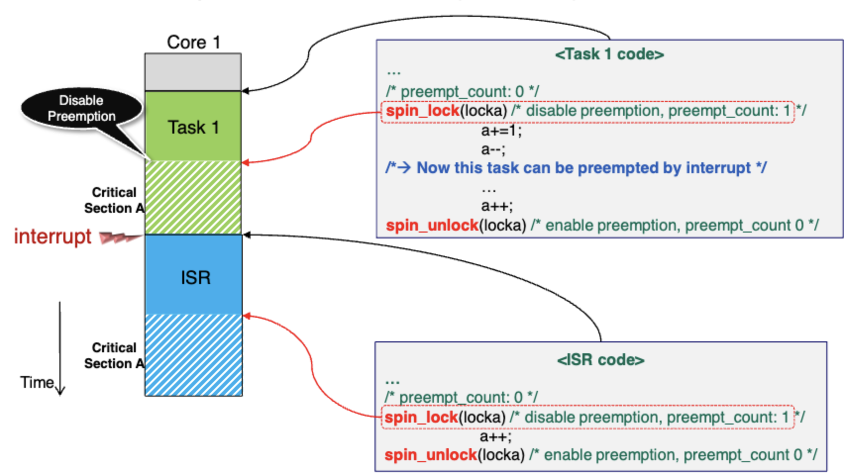 *참고로 ISR code에서 preempt_count는 0이다. preempt_count는 per task이다. 반면 interrupt는 based on core이다.