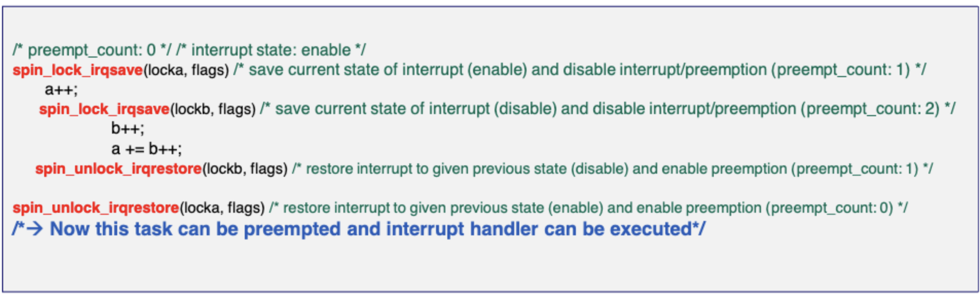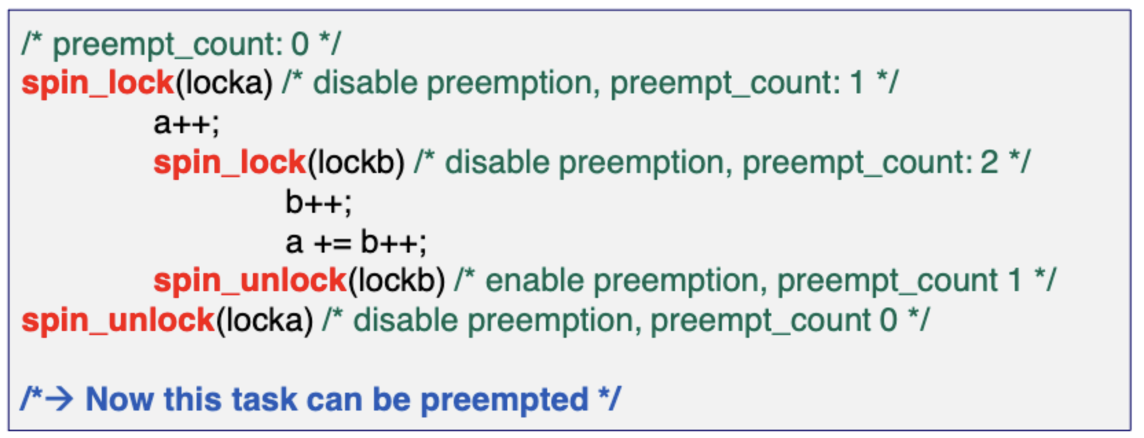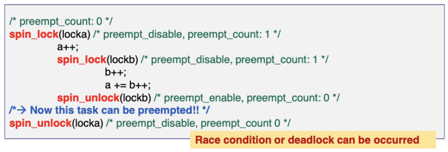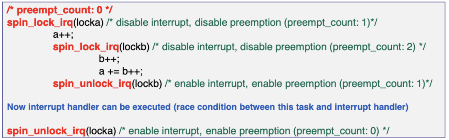 spin_unlock(lockb)에서 preempt_count를 false로 해버리면 아직 locka를 unlock하지않았음에도 불구하고 이 task는 preemption이 가능하다. 이때부터 a,b 자원에 접근하려는 경쟁이 생길 수 있다.