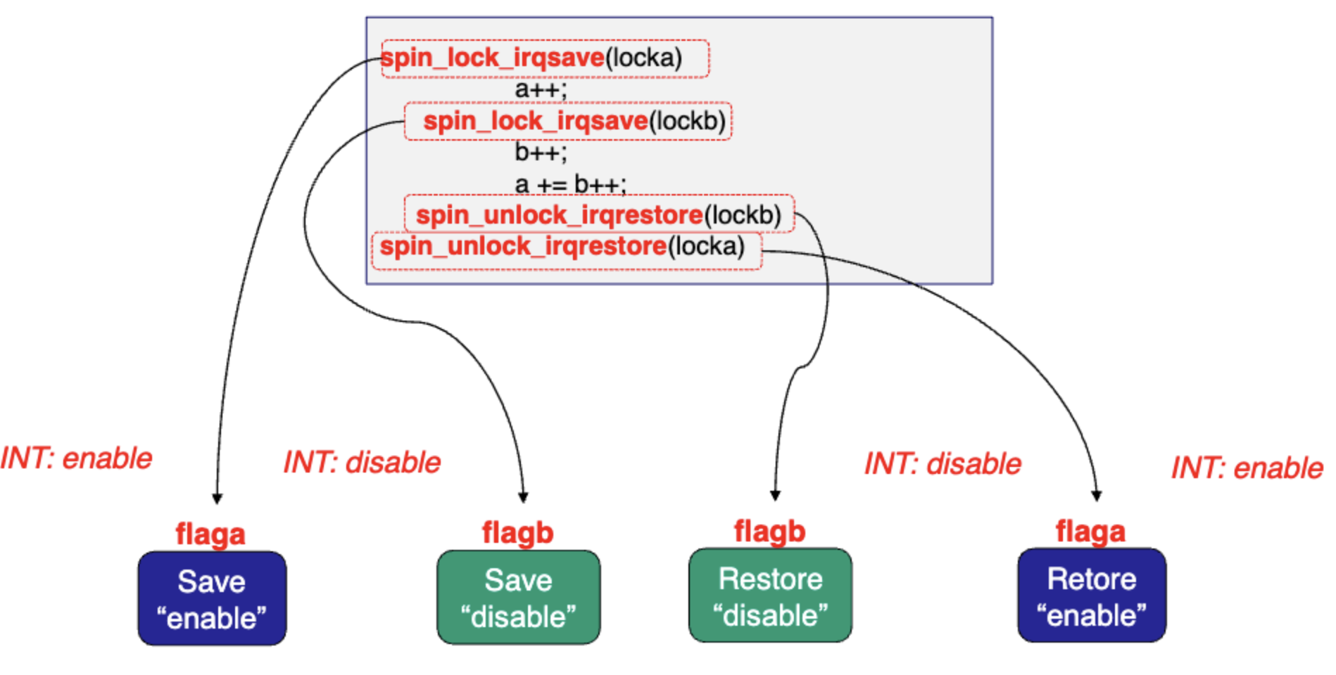 spin_lock_irqsave를 사용하면 이 문제를 해결할 수 있다. interrupt state를 기록했다가 하나씩 restore한다.