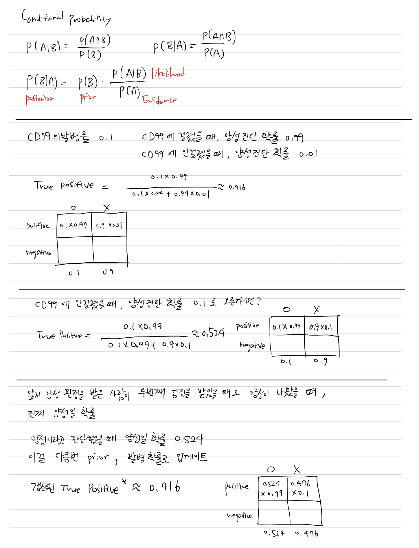 - Bayse theorem : A가 일어났을 때 B가 일어날 확률을 B가 일어났을때 A가 일어난 확률을 가지고 구할 수 있다.