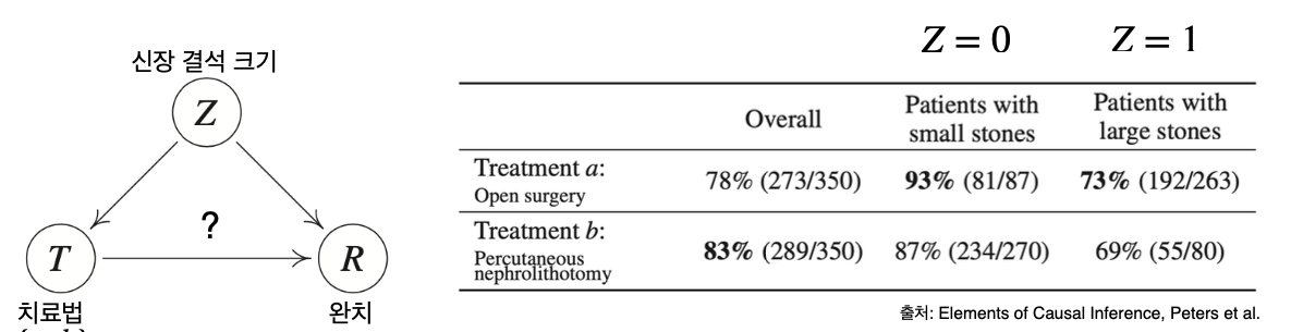 - 치료법과 완치에 영향을 주는 cofounding factor(중첩요인) Z를 제거해야지 올바른 인과관계 추론이 가능하다.