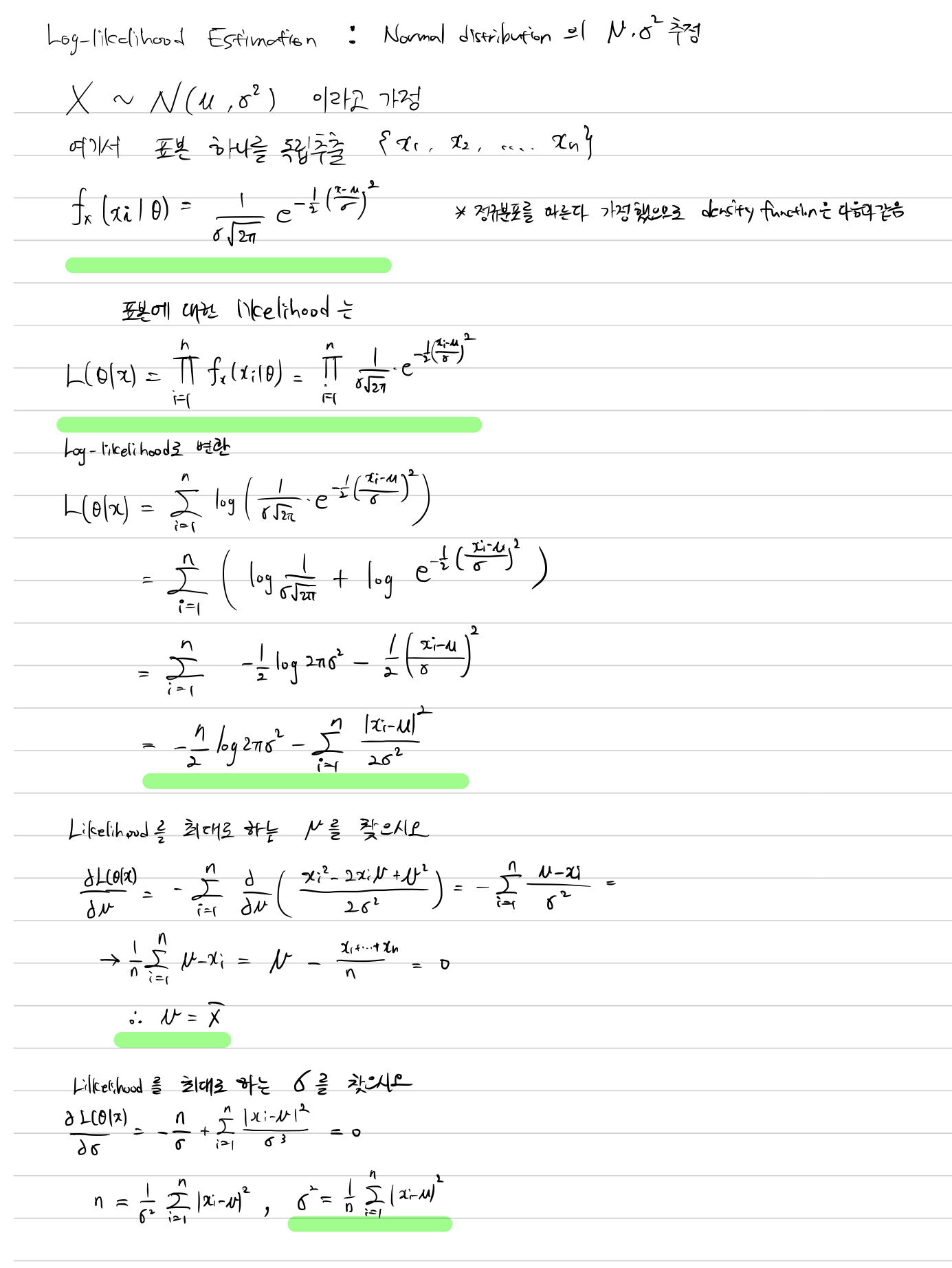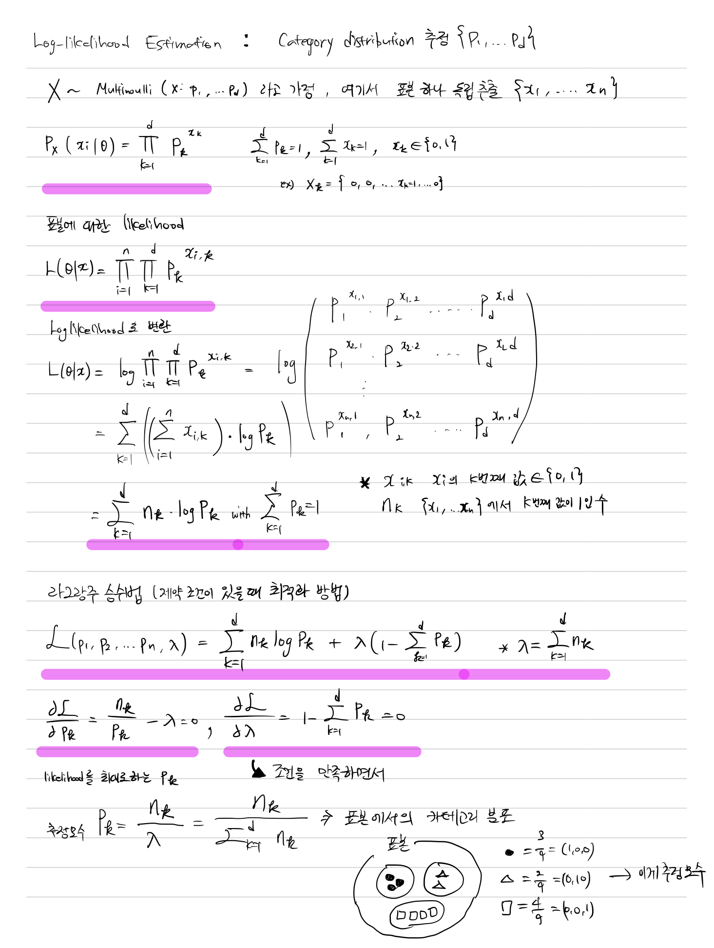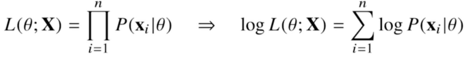 - 보통은 log를 씌워서 log-likelihood로 대신 구한다. 덧셈으로 계산할 수 있게 된다.