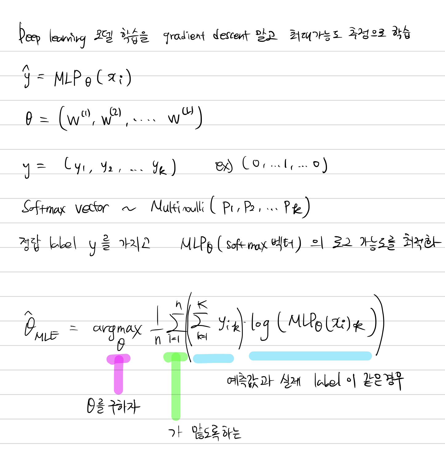 - 정답 레이블을 P, 모델 예측을 Q라고 했을 때, maximum likelihood estimation은 결국 이 쿨백-라이블러 발산(거리)를 최소화 하는 것과 같다.