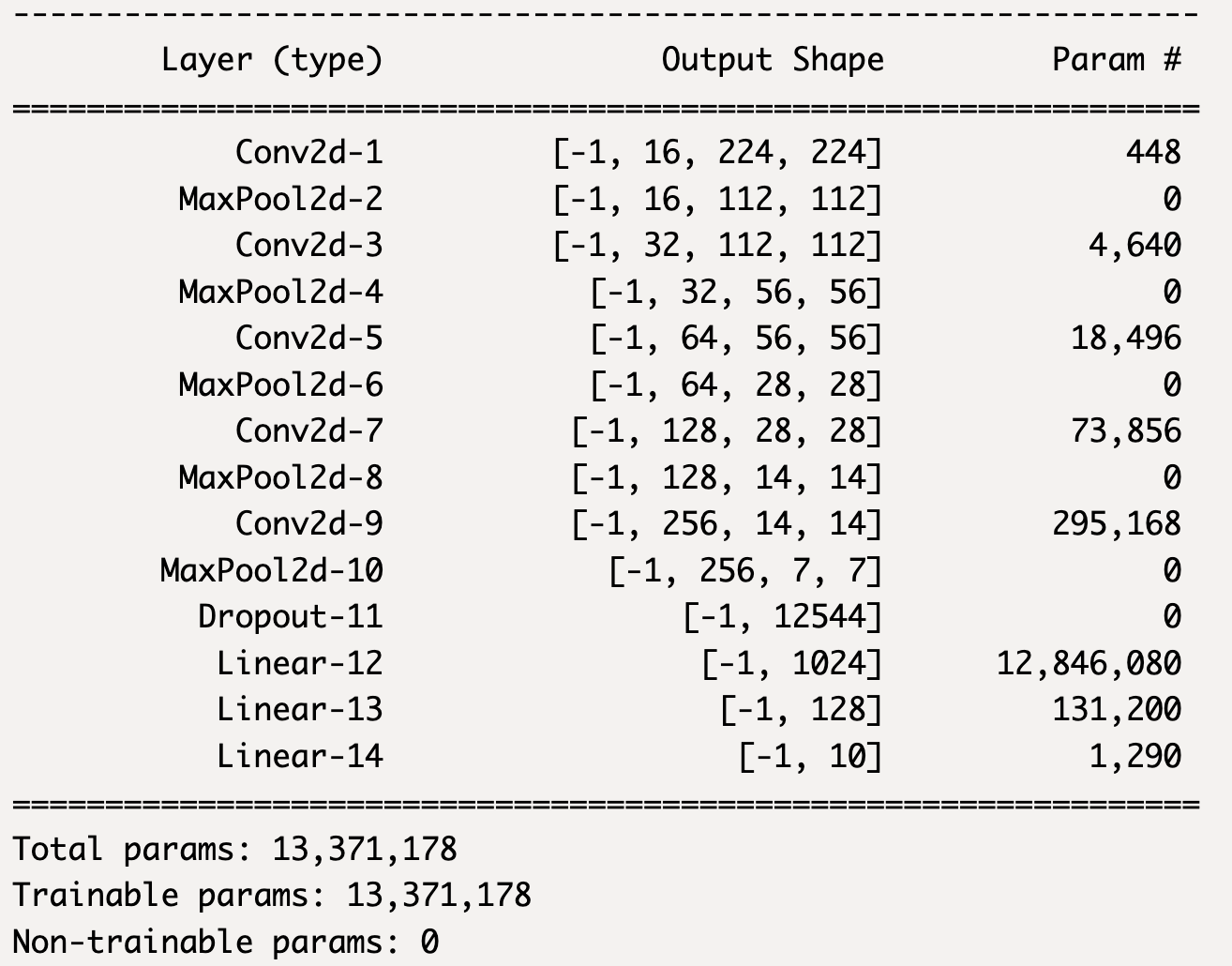- 참고로 torchsummary라이브러리를 사용하면 더 깔끔한 모델의 설명을 볼 수 있다.