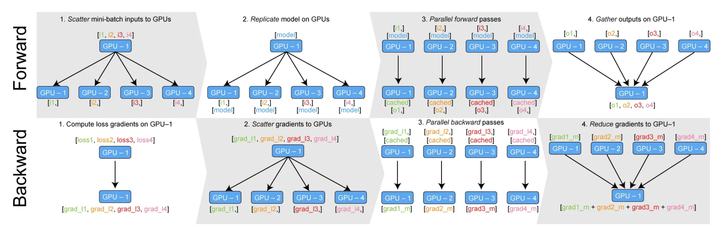 - DataParallel : 한명의 gpu가 나머지 gpu에게 데이터 분배, 취합 등의 역할을 수행 (다른 gpu보다 메모리 더 사용)