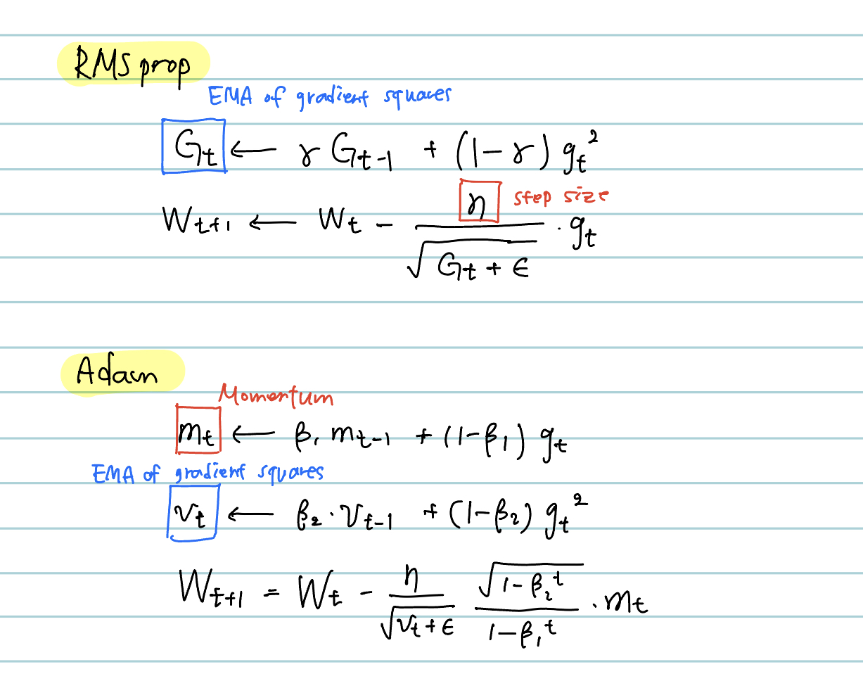 - Adagrad에서 G는 sum이였지만 여기서는 지수이동평균으로 Gt가 커지는 것을 제한할 수 있다.