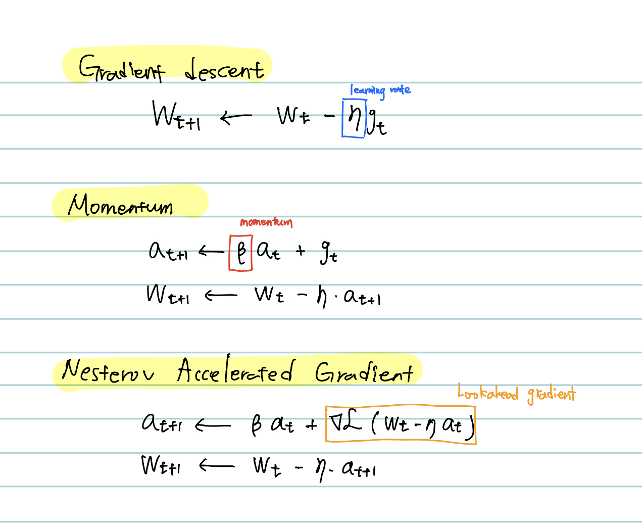 - 현재까지의 momentum과 해당 momentum이 안내하는 곳으로 이동한 곳에서의 gradient를 가지고 구한다.