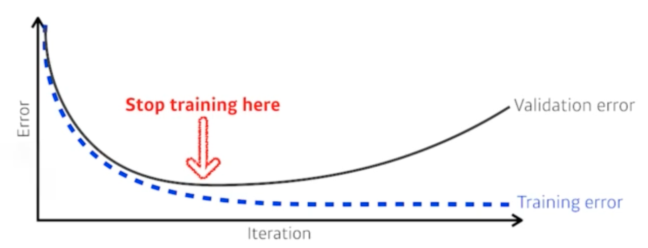 - validation loss가 커지는 지점 전에서 학습을 멈춘다.