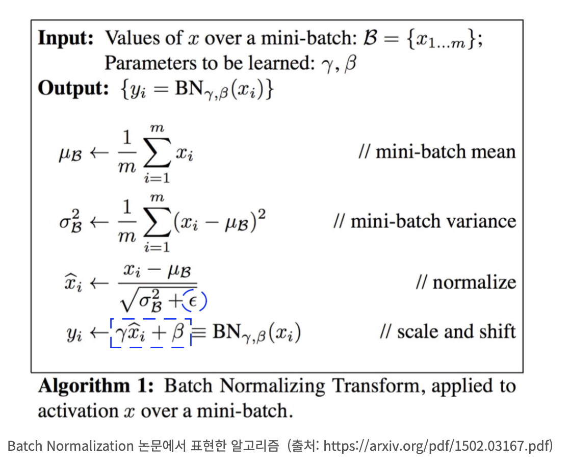 - 참고로 batch norm은 감마와 델타가 학습되는 layer다. 정규화한 값에 r를 곱하고 베타를 더해주는 작업이 이어진다.