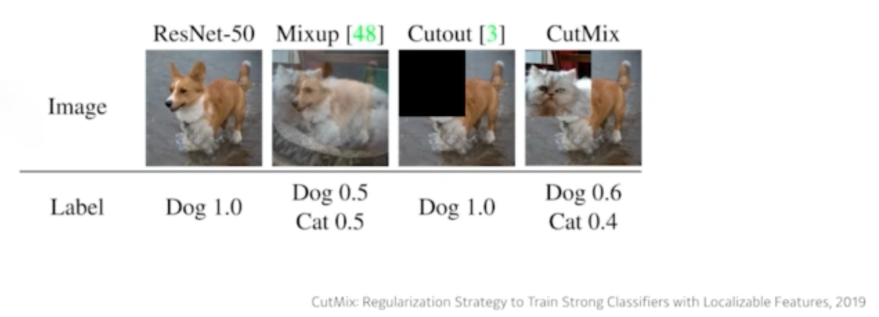 - Cutout, CutMix, Mixup 중에서 Mixup만 살펴보면 강아지와 고양이 사진을 섞고 label도 dog 0.5, cat 0.5로 만드는 방법이다.