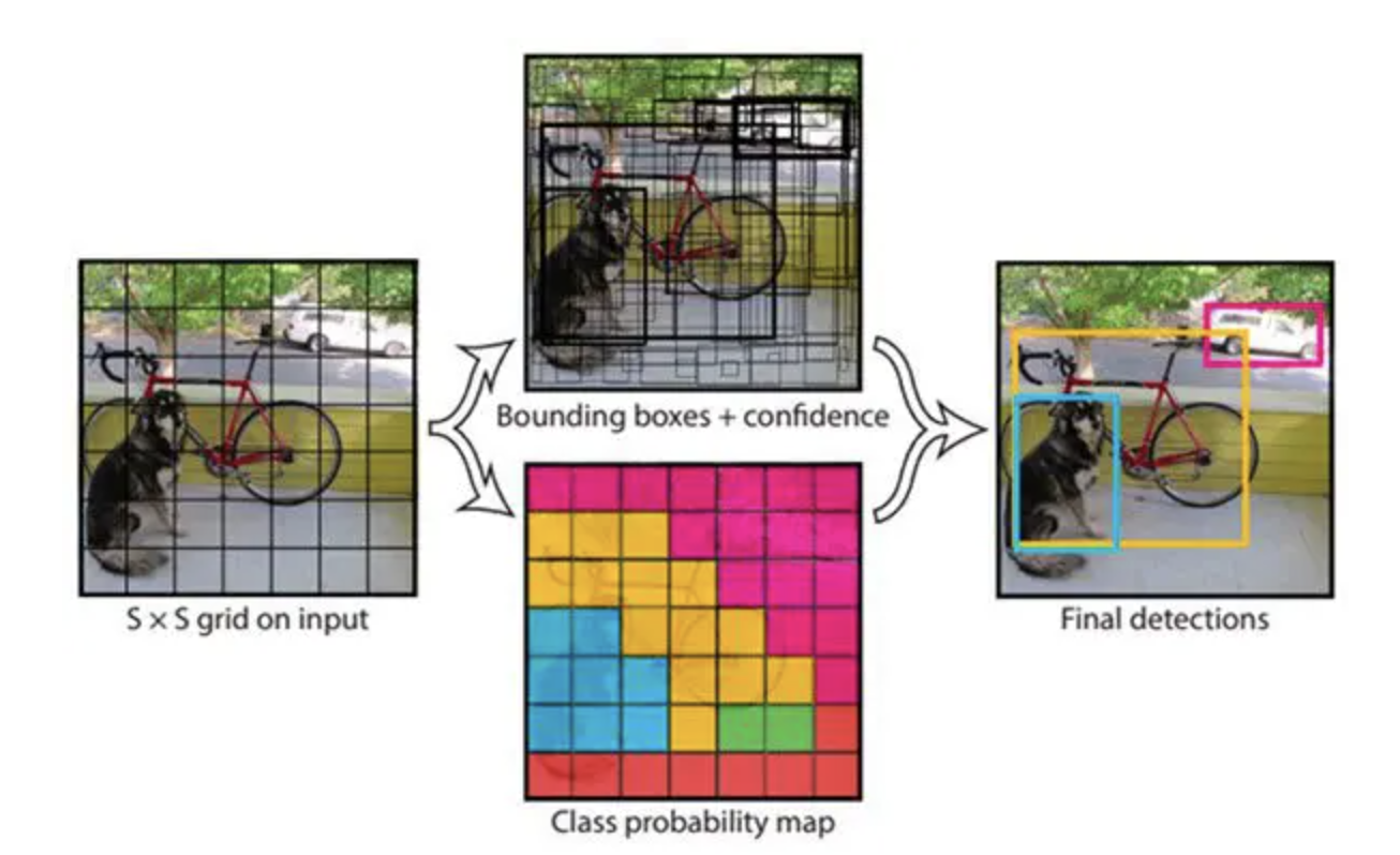- 이와 동시에 그리드 셀들의 classification을 한다.(개, 자전거, 차)