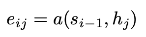 먼저 enery_ij를 살펴보자. decoder가 i번째에 token을 예측할때는 이전 hidden state, s_{i-1}을 활용한다. 따라서 e_ij는 decoder가 i번째의 token을 예측을 할 때 s_{i-1}과 encoder의 j번째 hidden state가(hj) 얼마나 관련이 높은가? 를 scalar로 계산하는 일종의 (attention) score이다.