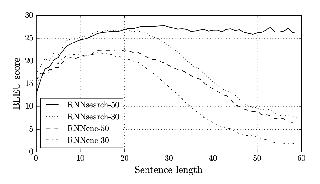 본 논문에서는 이 fixed length context vector가 성능 향상에 있어서 bottleneck이라고 보았다. 실제로 encoder-decoder 모델들을 보면 training corpus보다 긴 문장을 실제로 마주했을 때 급격한 성능하락을 보였다.