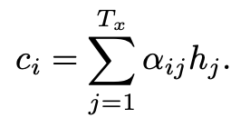그럼 각 시점에서의 encoder hidden state hj에 우리가 구한 weight(attention score a_ij)을 곱한다. T개의 vector들을 모두 더해서 i 시점에서의 context vector를 만든다.(weighted sum of all the annotations)