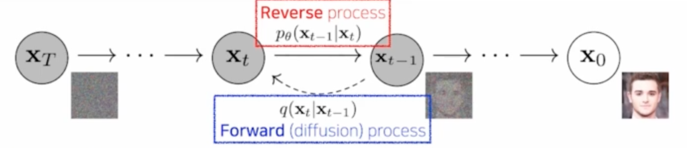- forward과정은 이미 정해져있는 과정이다. 모델이 학습하는건 Reverse 과정이다. 즉 복원하는 과정을 학습한다.