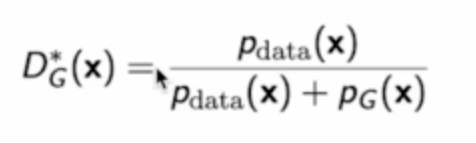 - G를 고정이라고 생각하고 위 식을 최대로 하는 D를 찾아보자. 미분해서 0되는 점을 찾으면된다. 그 지점에서의 가장 Optimal한 Discriminator는 위 처럼 생겼다.