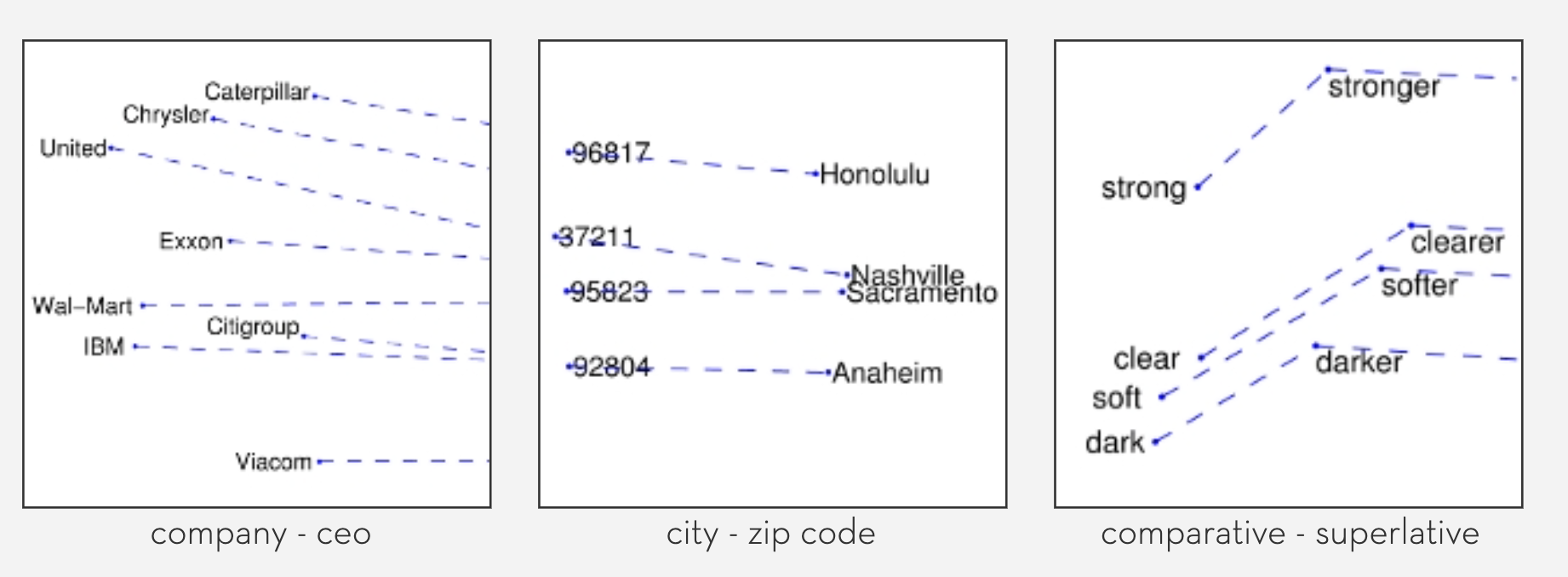 단어들간의 관계가 유사한 방향과 크기를 나타냄을 살펴볼 수 있다.