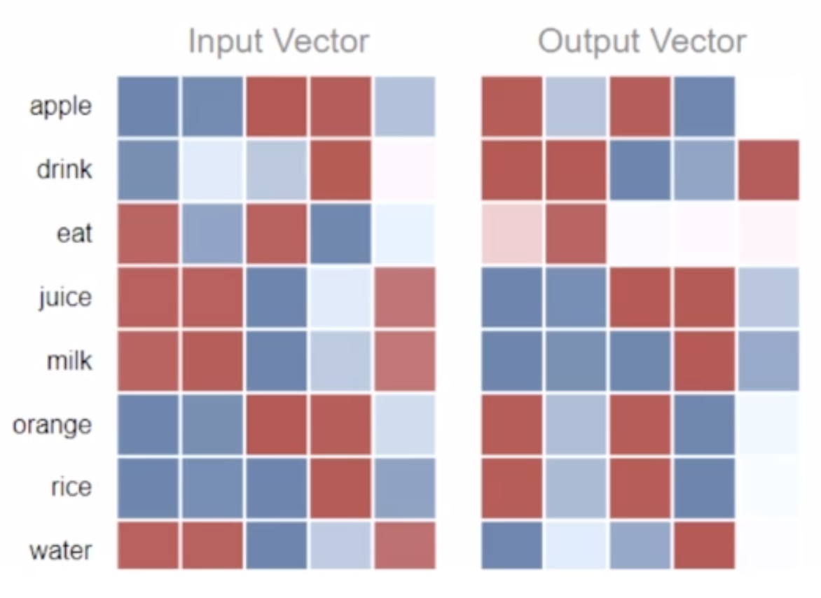 input vector가 W.T에 해당하고 output vector가 W'에 해당한다. 둘 중 아무거나 embedding matrix로 사용해도 되지만 통상적으로 W.T, input vector를 많이 사용한다.