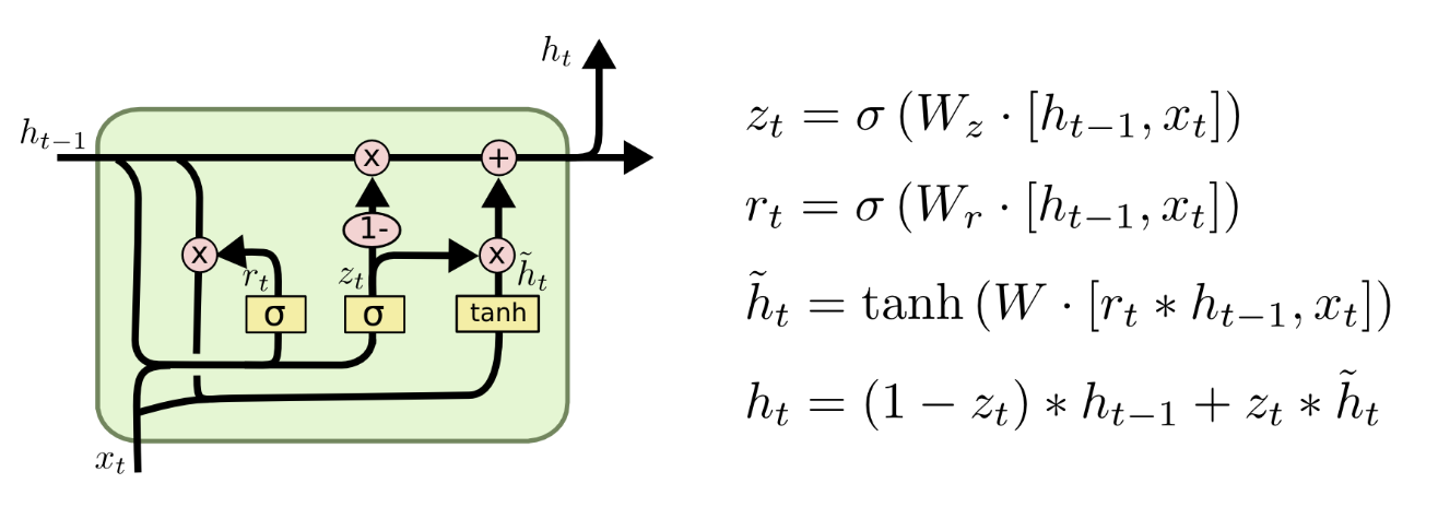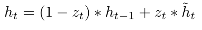 의미를 담고 있는 h_t 틸다는 previous hidden state에 reset할 확률을 곱한 r_t*h_t-1 과 x_t를 가지고 구한다. (이때 W는 [Wxh, Whh]) lstm에서 gate gate를 통과해서 C_t 틸다를 구한 것과 대조적이다.