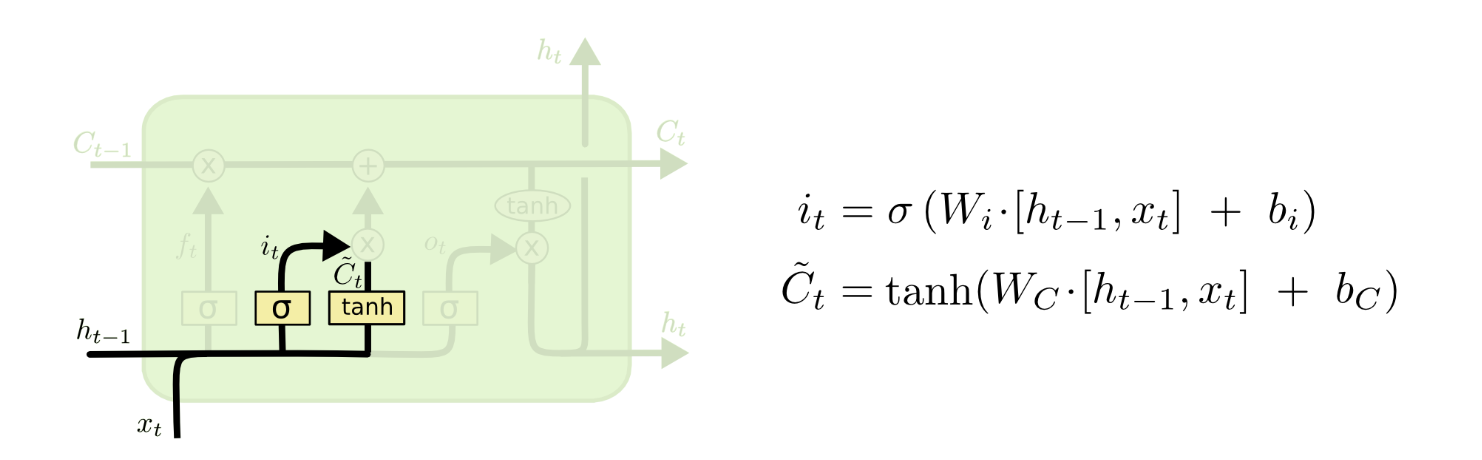 input gate를 거쳐서 나온 확률 벡터 i_t, 그리고 tanh를 거친, 의미를 지니고 있는 벡터 C_t 틸다 두개를 elementwise muliplication한다. 즉 새로 들어온 정보 중에 얼마만큼만 update에 반영할지를 결정한다.