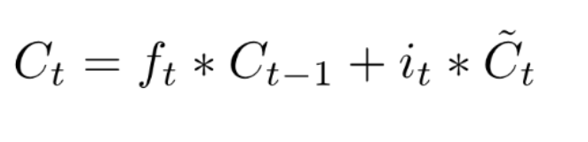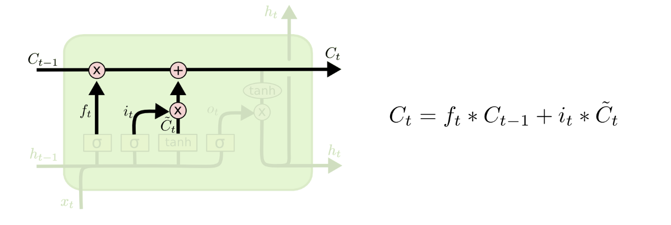 그럼 새롭게 구한 cell state C_t는 기존 정보를 잊은 결과(f_t * C_t-1) + 새로운 정보를 추가(i_t * C_t 틸다) 로 구해진다.