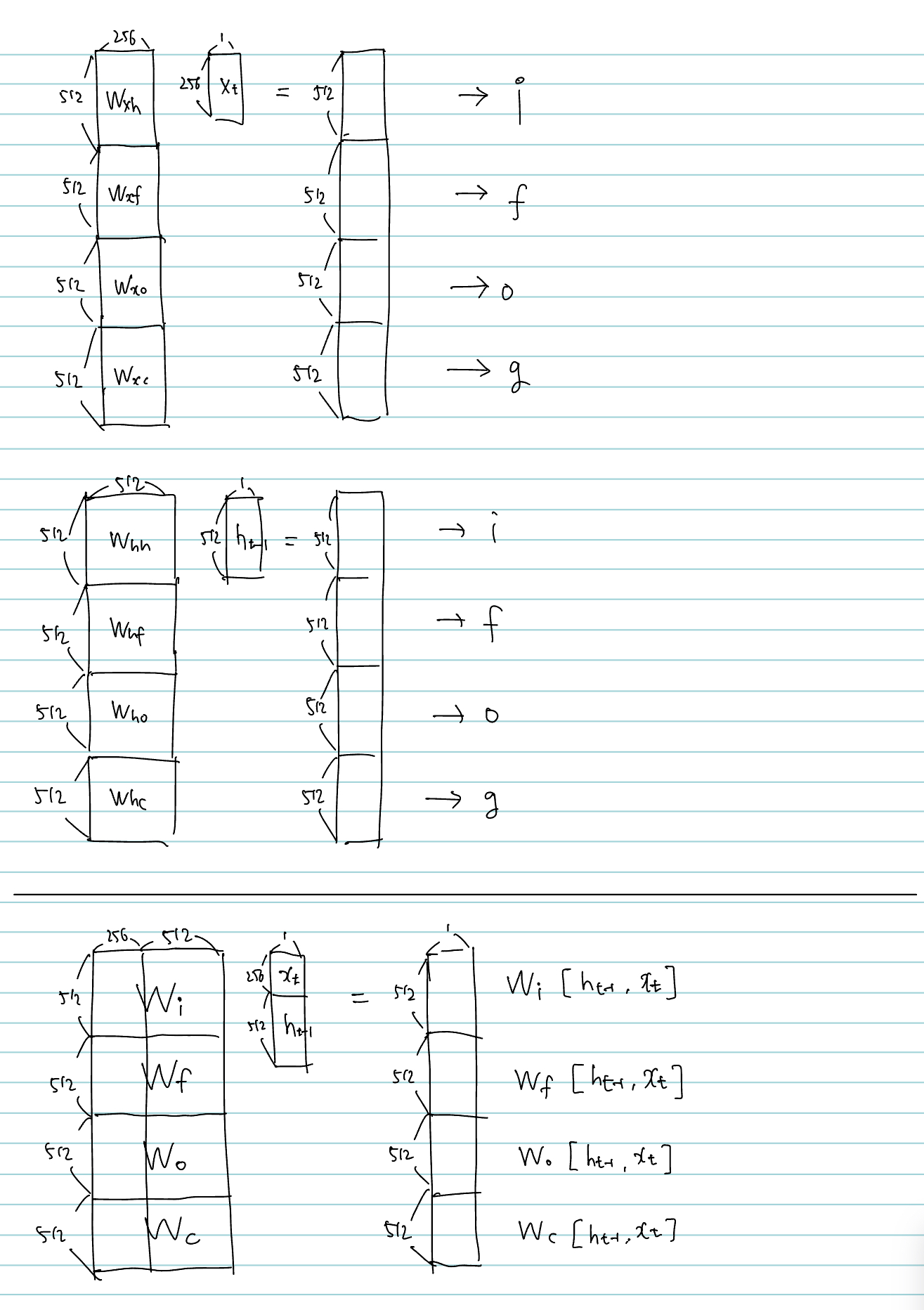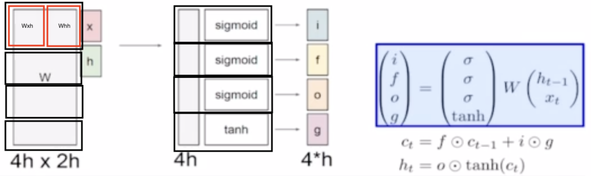 input gate, forget gate, output gate, gate gate를 위해 4번 f(Wxh*x + Whh*h + b)를 수행해야 하므로 서로 다른 4개의 W'를 이어 붙여서 결국 W(4h,h)이다.