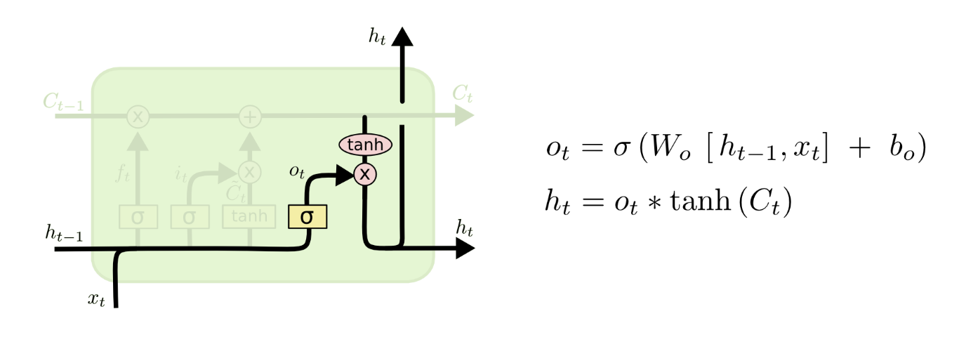 output gate를 통과하고 나온 벡터와 현재 시점에서 구한 tanh(cell state C_t)를 elementwise 곱한다. 이 역시 얼마나 output으로 쓸지를 곱하는 것이다.