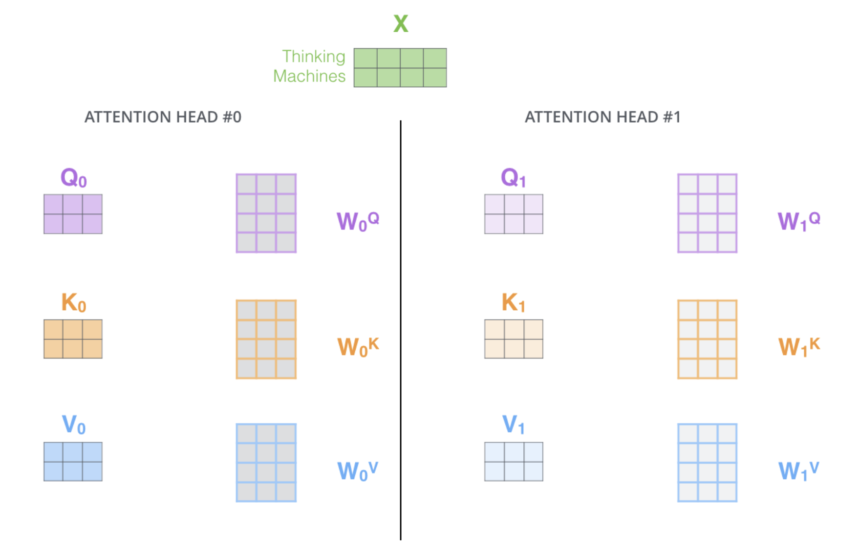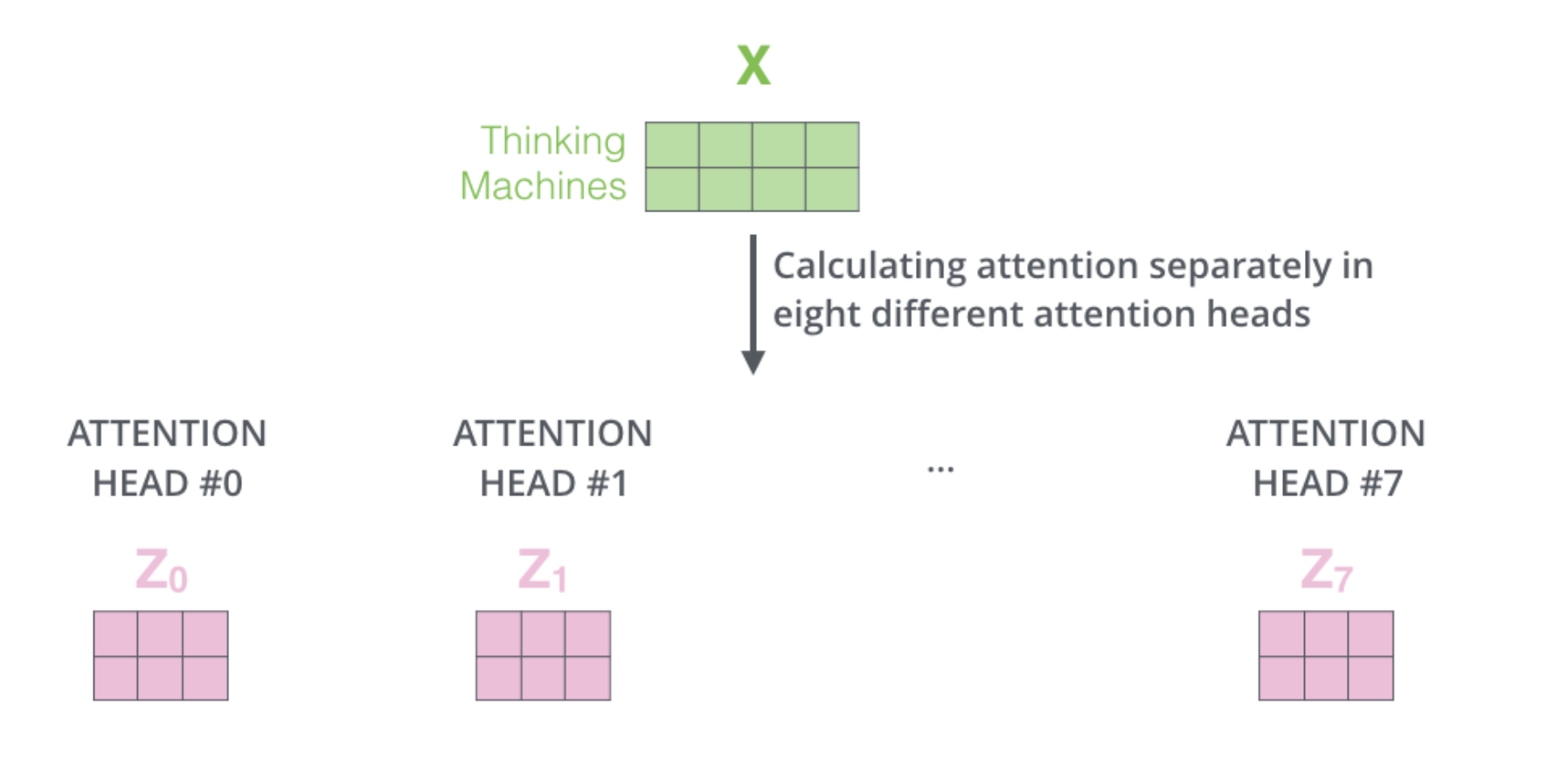 즉 Wq, Wk, Wv가 여러개 존재한다. 서로 다른 attention 블럭마다 서로 다른 encoding vector가 만들어지고 이를 모두 concat하여 하나의 결론도출에 사용한다.