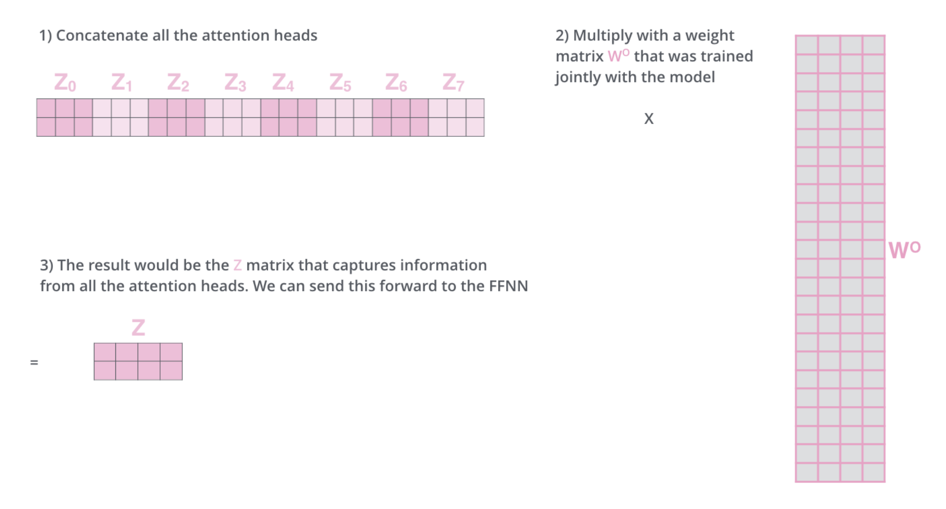 이걸 모두 concat한 후에 W-Linear transform을 거치고 하나의 최종 결과 Z를 얻는다.