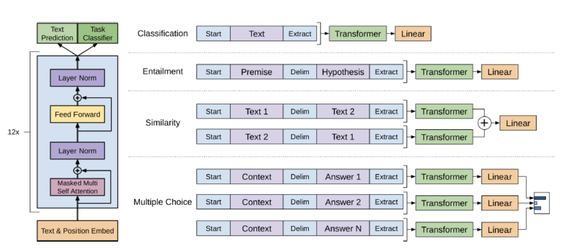 Entailment : 다수의 문장으로 구성된 Input이 있을 때, 각 문장 사이에 delim token을 추가해서 두 문장의 논리적 관계가 옳은지를 검사하는 task이다. 이 경우도 extract token의 결과를 Linear layer에 통과하게 하여 분류기로 동작할 수 있다.
