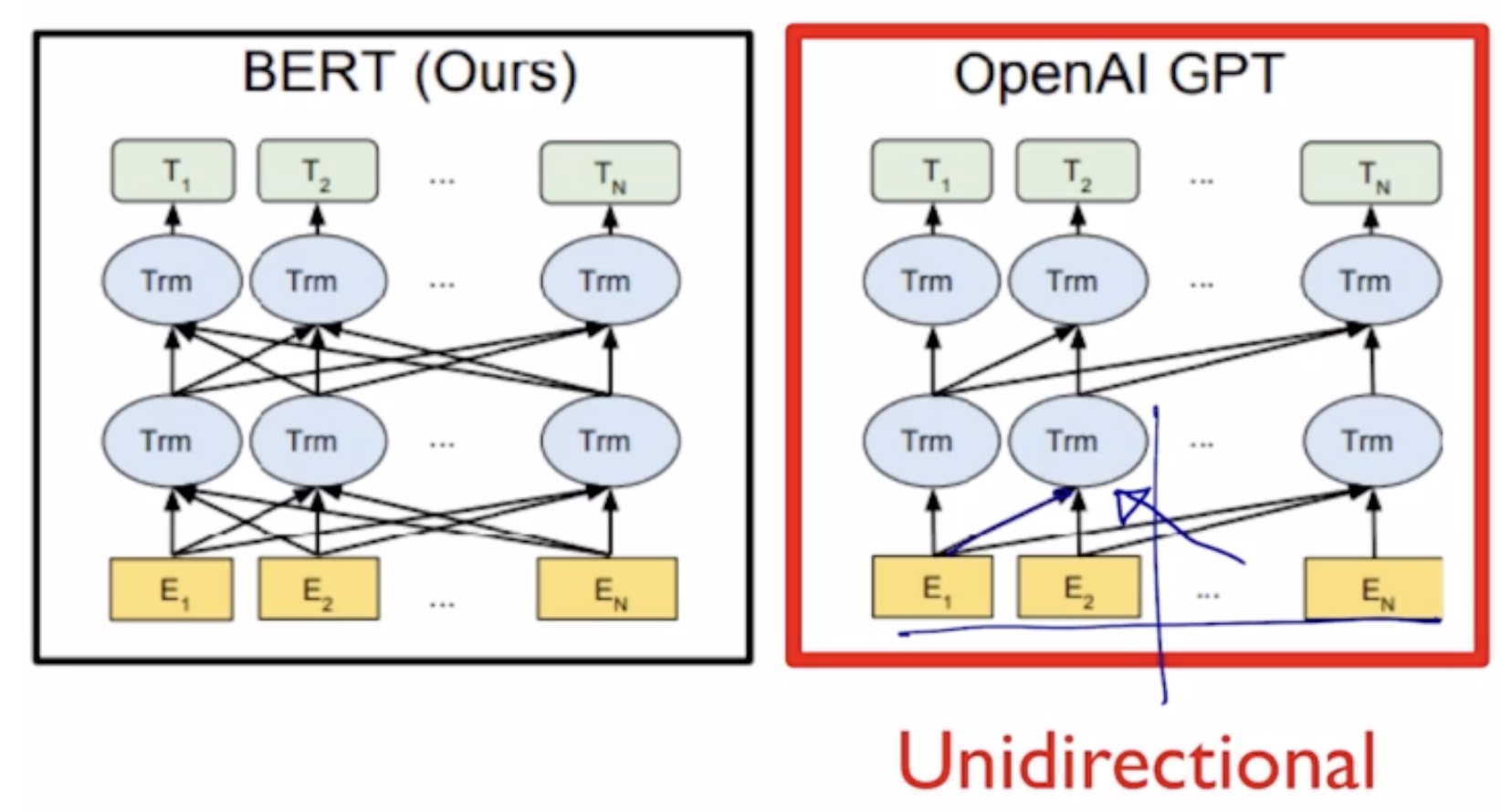 GPT는 다음 단어를 예측하는 task를 학습하므로 E2 시점에서 단어를 예측할때 E1만 살펴보지 뒤에 E3부터는 보지 않는다. 그래서 gpt는 Transformer 모델의 decoder 부분을 사용한다.