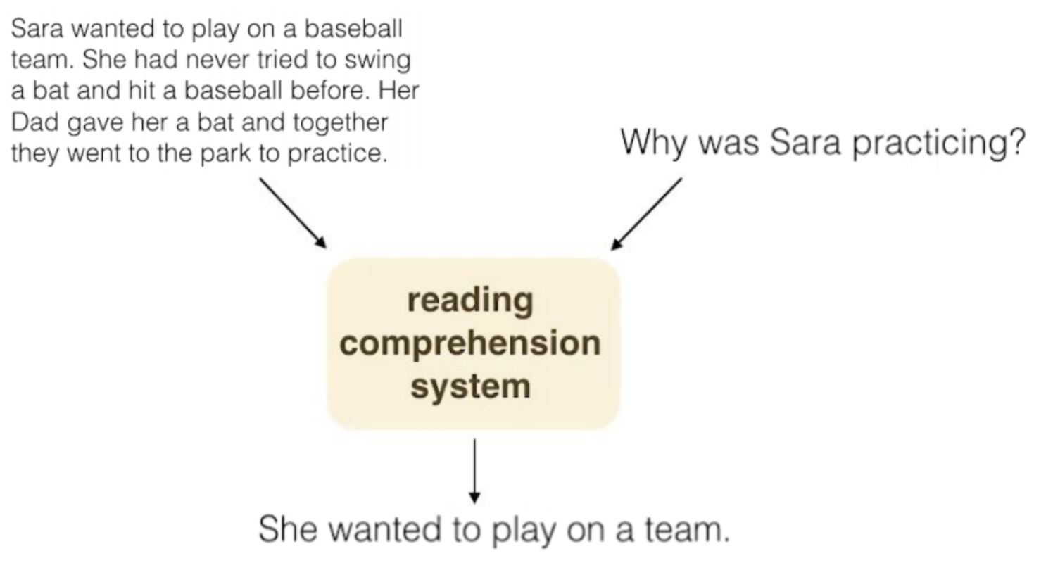 기계 독해 기반 질의응답 task를 말한다. 단순히 질문에 대답하는게 아니라 주어진 글을 읽고 얻은 정보를 기반으로 주어지는 질문에 정답을 찾는 것이다. (참고로 이 task를 위해 사용할 수 있는 데이터셋으로 SQuAD 데이터셋이 있다. )