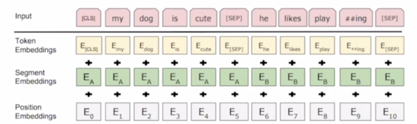따라서 문장을 segment로 분류해서 첫번째 문장에게는 동일한 벡터를 더해주고 두번째 문장의 단어들에게는 다른 동일한 벡터를 더해준다. 이 벡터는 학습을 통해 결정된다.