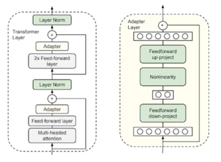 모델의 규모가 너무 커지는 바람에 학습에 많은 비용이 든다. 따라서 기존 transformer 구조 안에 feed forward layer와 nonlinearlayer로 구성된 adapter layer를 추가한다. 그 외에 layer는 모두 freeze시키고 adapter layer만 fine-tuning시에 학습시킨다.