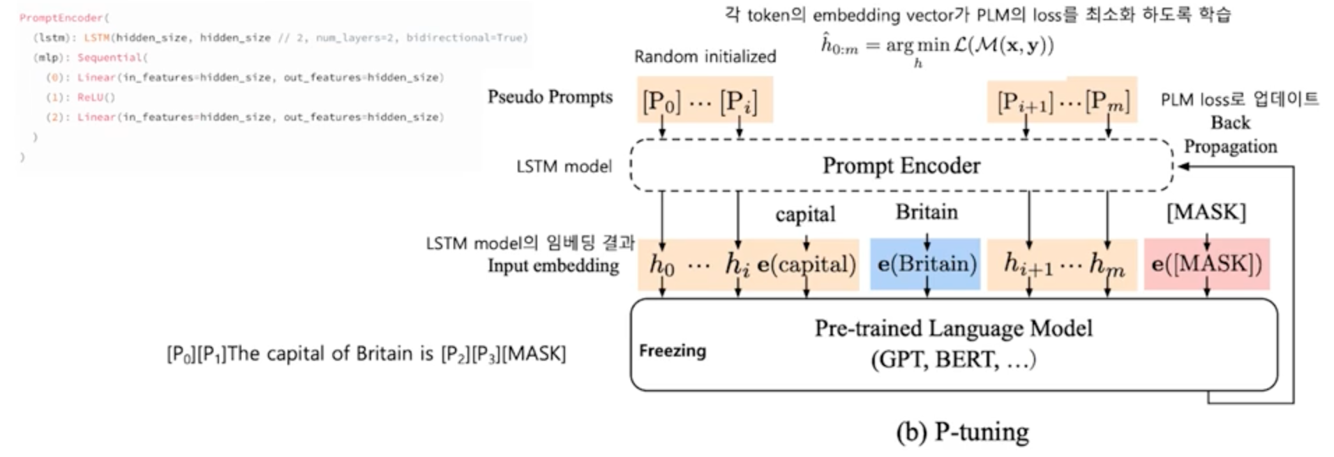 어떤 vector 값을 token처럼 넣어준다. 모델이 예측한 정답([MASK]에 해당하는 벡터)과 실제 정답과의 차이를 back propagation으로 prompt encoder를 학습시킨다.