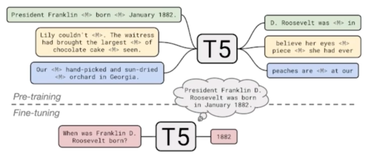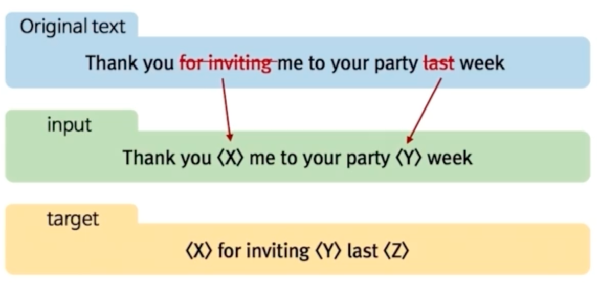 하나의 토큰만 masking하는게 아니라 for inviting을 X로 바꿔버린다. 더불어 문장에 여러 토큰을 masking한다. 이렇게 만들어진 문장이 Input이 되고 <X>, <Y>를 맞추도록 학습된다.