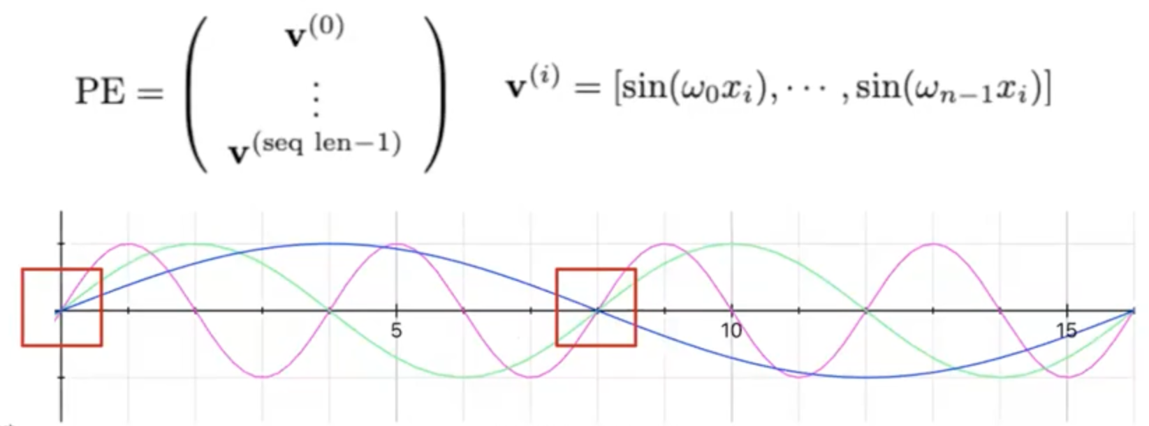 주기가 다른 n개의 sine함수들로 positional vector를 만든다. 다만 일정 step마다 positional vector가 동일해지는 문제가 있다.