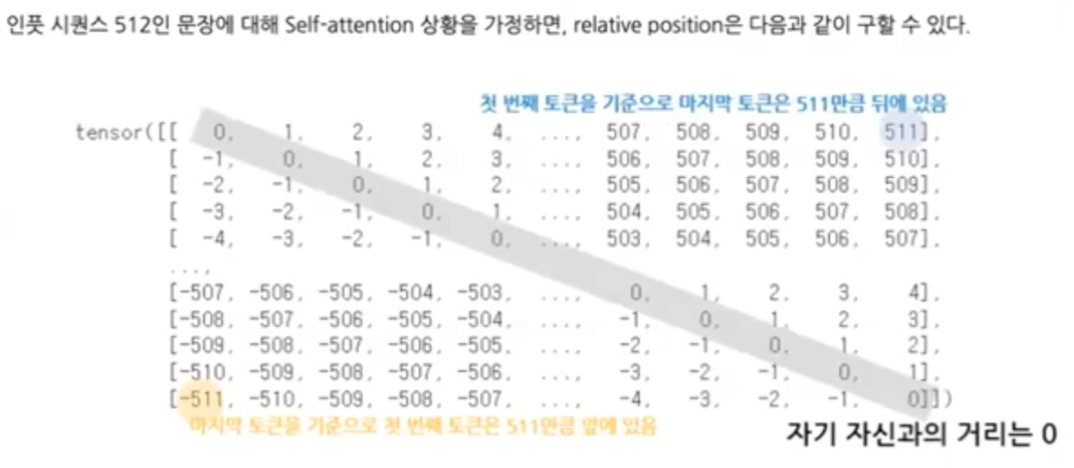 상대적 거리란, '이순신은'에 대해서 attention을 계산할때 다른 토큰에 1, 2, 3을 위치정보로 더했다면 '조선'에 대해서는 중기의 무신이다 라는 토큰들에게 1, 2위치 정보를 더해주는 것이다. (정확한 설명은 아니고 이런 느낌이다 정도로 이해하자)