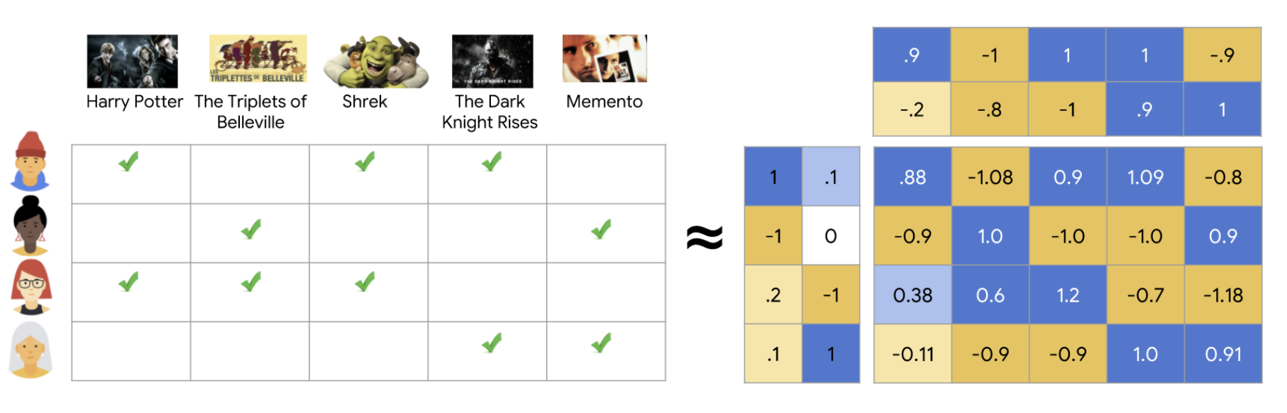 유저가 어떤 영화에 대해서 몇점의 평가를 내릴지 알면 추천시스템으로 활용할 수 있다. 대게 유저가 모든 영화에 대한 평가를 남길 수 없기 때문에 대부분 왼편의 rating matrix는 굉장히 sparse하다.