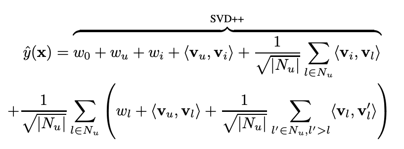 이렇게 나오는데 정확히 SVD++ 모델을 포함한다. 게다가 추가로 user와 N_u의 pair끼리의 interaction, N_u를 구성하는 feature들끼리의 interaction도 고려하는 모양이다.